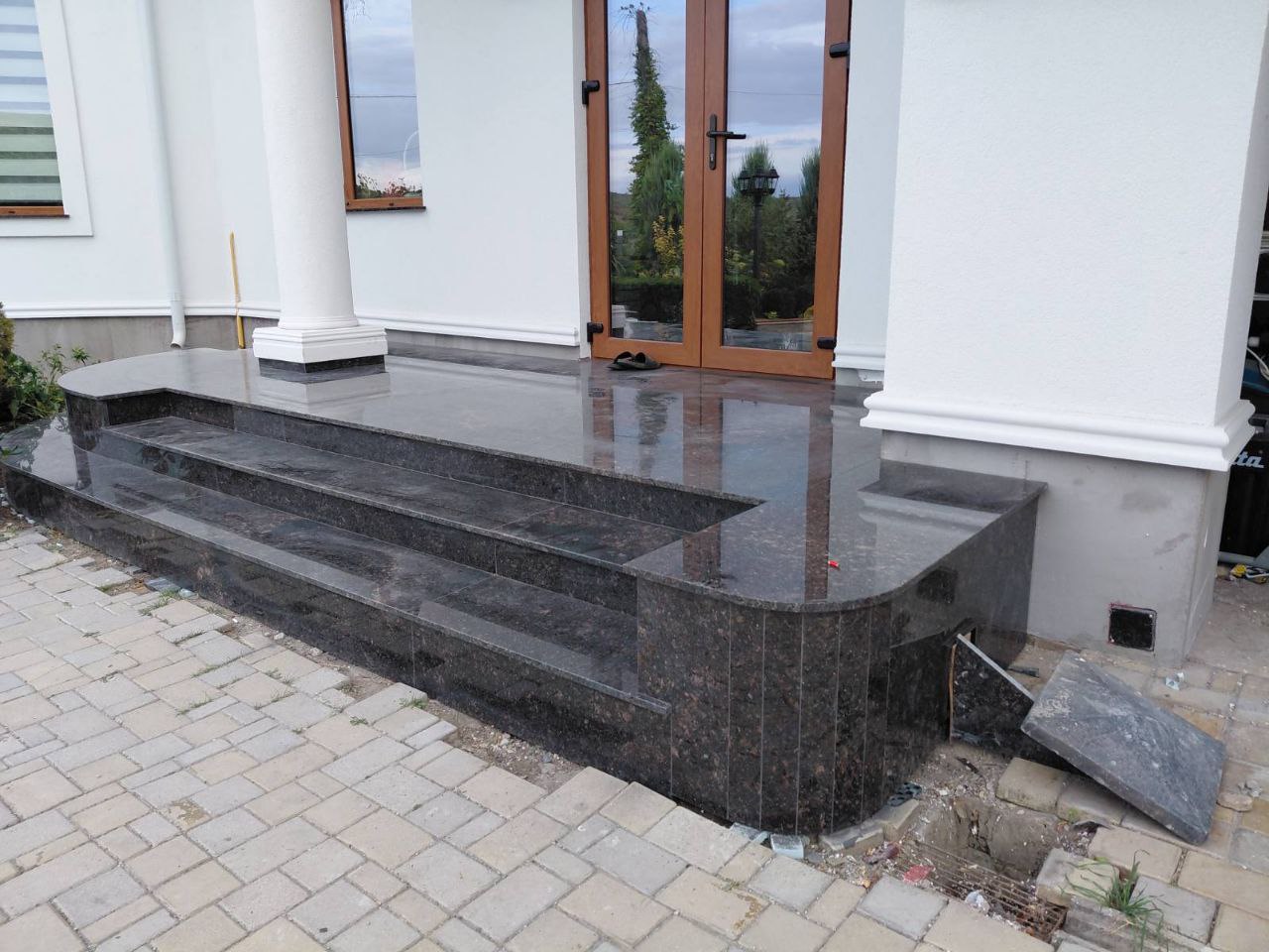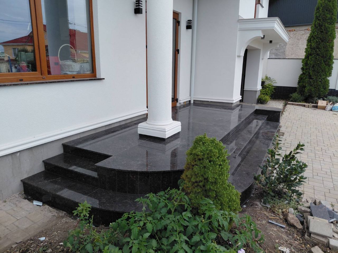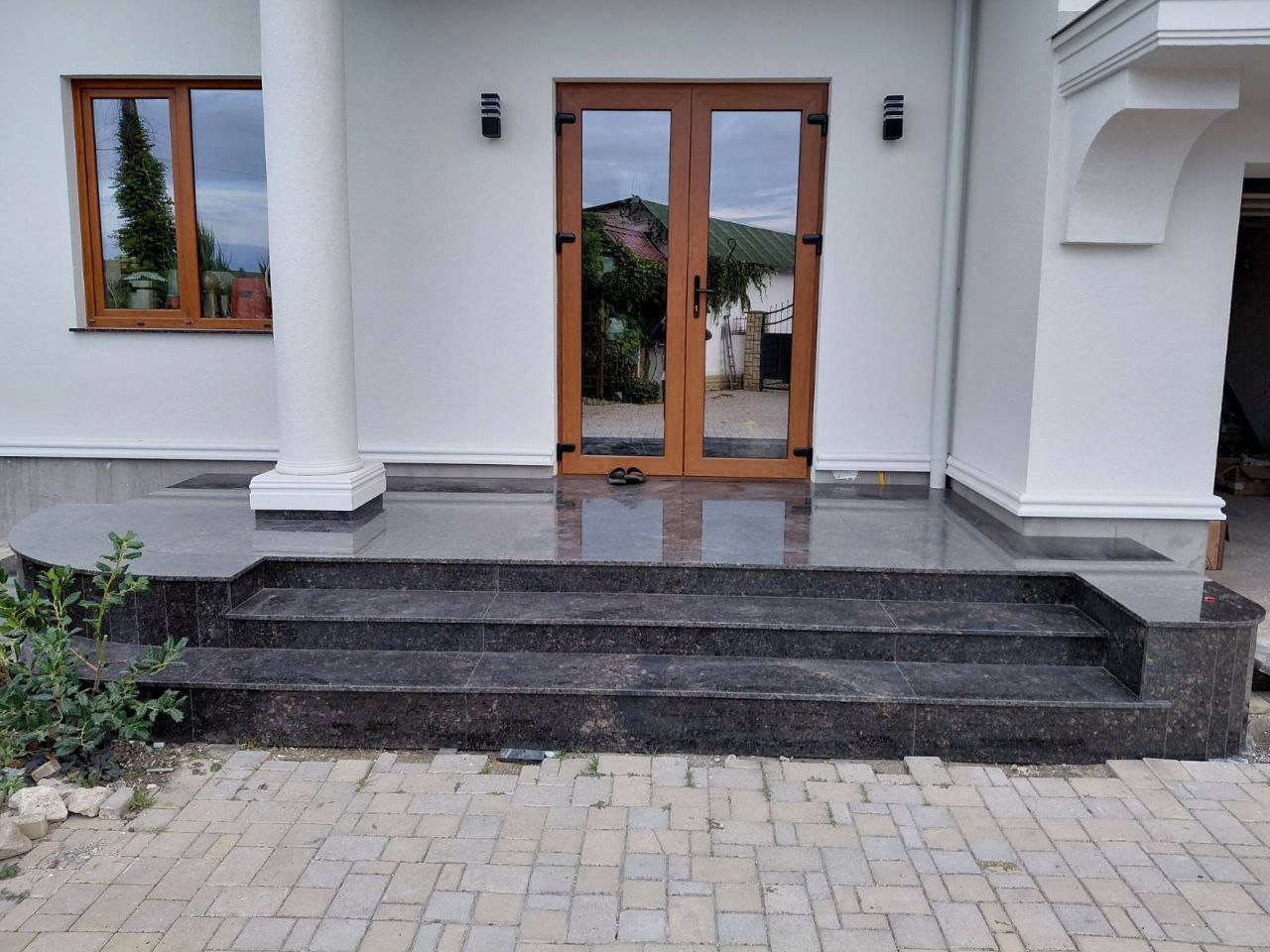 Accesul principal – treptele și platforma din granit negru lustruit subliniază arhitectura casei și îi oferă un aspect elegant și rafinat. Fiecare element este montat cu precizie pentru o rezistență sporită și un efect vizual impresionant.