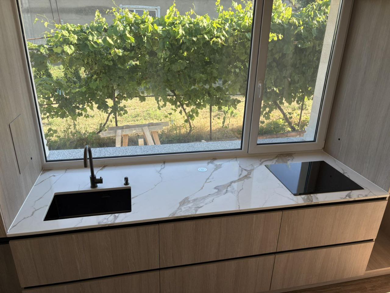 Zona de bucătărie – un design modern cu blat din piatră albă, perfect asortat cu fațadele din lemn. Chiuveta și plita încorporate creează un interior armonios, luminos și practic.