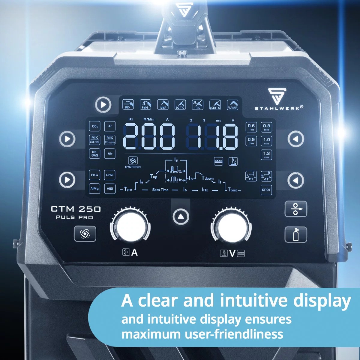 Aparatul de sudură STAHLWERK CTM-250 Puls Pro este un aparat inverter puternic 6-în-1, cu un curent de sudare de 200 A, care combină procesele de sudare TIG, MIG/MAG, MMA și FLUX. Datorită funcției de sudare pulsată, aparatul este potrivit și pentru sudarea cu sârmă tubulară, precum și pentru sudarea tablelor subțiri și a aluminiului (în modul MIG/MAG).