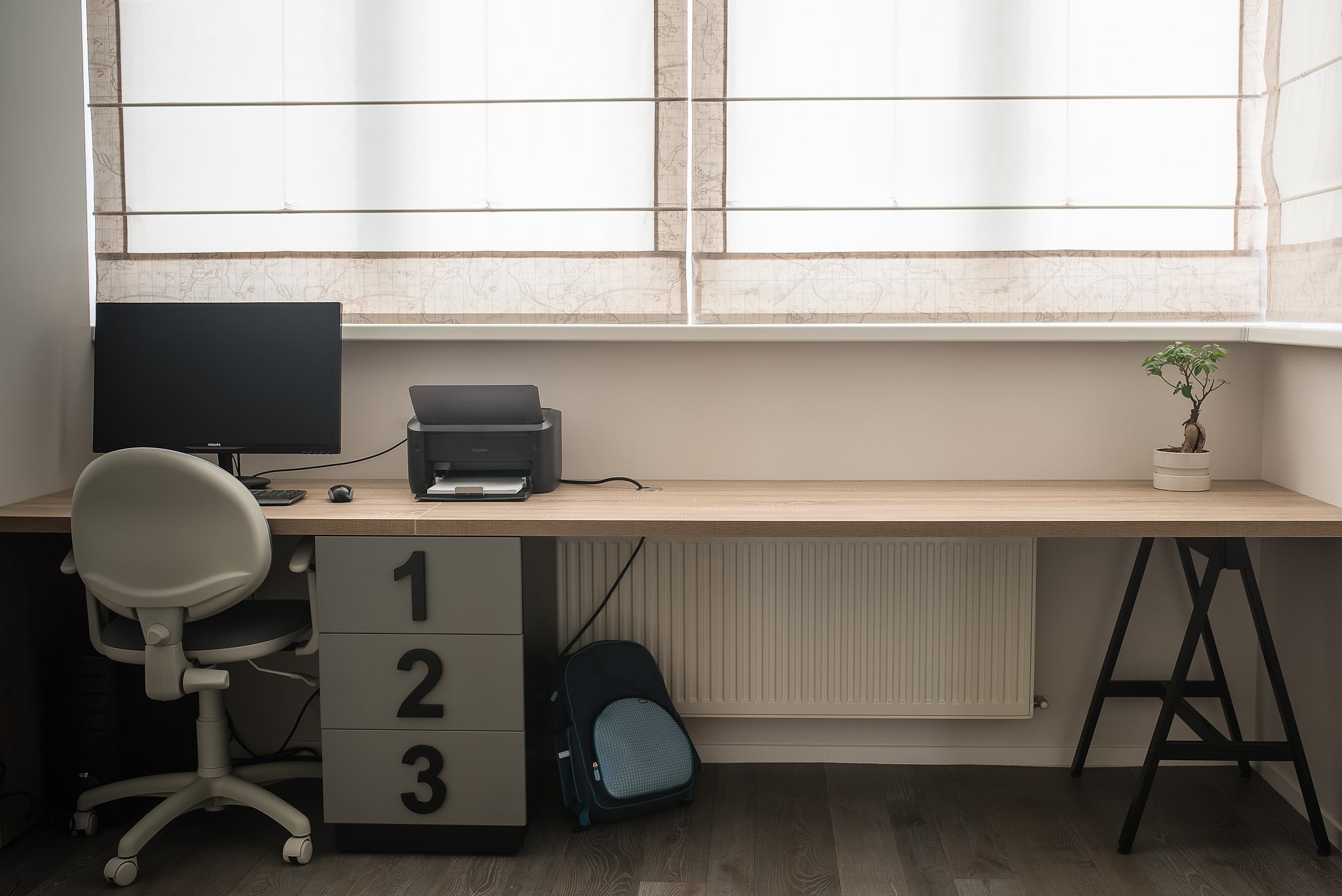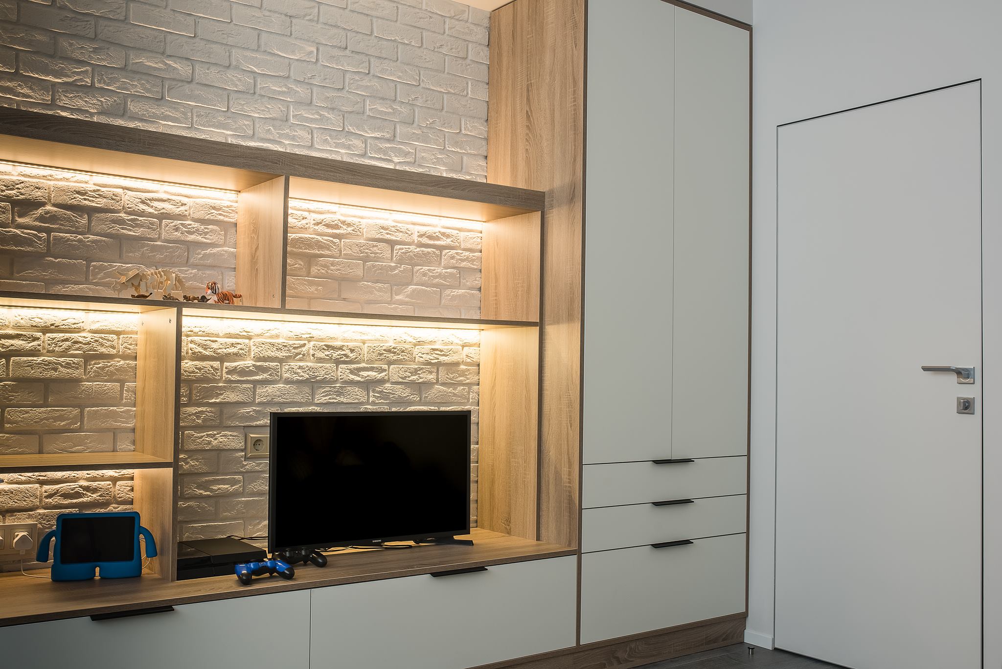 Designul acestei camere pentru copii se bazează pe simplitate și concizie, creând astfel un interior practic și natural pentru copil. Componenta practică a camerei este în primul rând un spațiu organizat pentru lucru - biroul mare, realizat din materiale cu textură de lemn, oferă spațiu pentru toate rechizitele școlare, iar sertarele numerotate de pe birou oferă și mai mult spațiu de depozitare. Camera dispune, de asemenea, de mobilier multifuncțional de-a lungul peretelui, cu rafturi practice și un dulap mare pentru haine, toate în perfectă armonie cu designul general al camerei.
