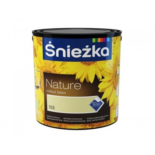 Sniezka Nature 103 disponibila în 56 culori este un latex emulsie de înaltă calitate. Se formează un strat mat, complet care permite pereții sa "respire", rezistent la curățare umedă