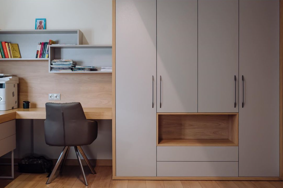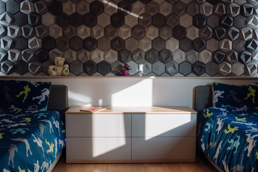Данная детская комната обустроена по последним и самым современным тенденциям в дизайне. Декор на стене представляет собой интересный и необычный прием, который сразу же притягивает внимание