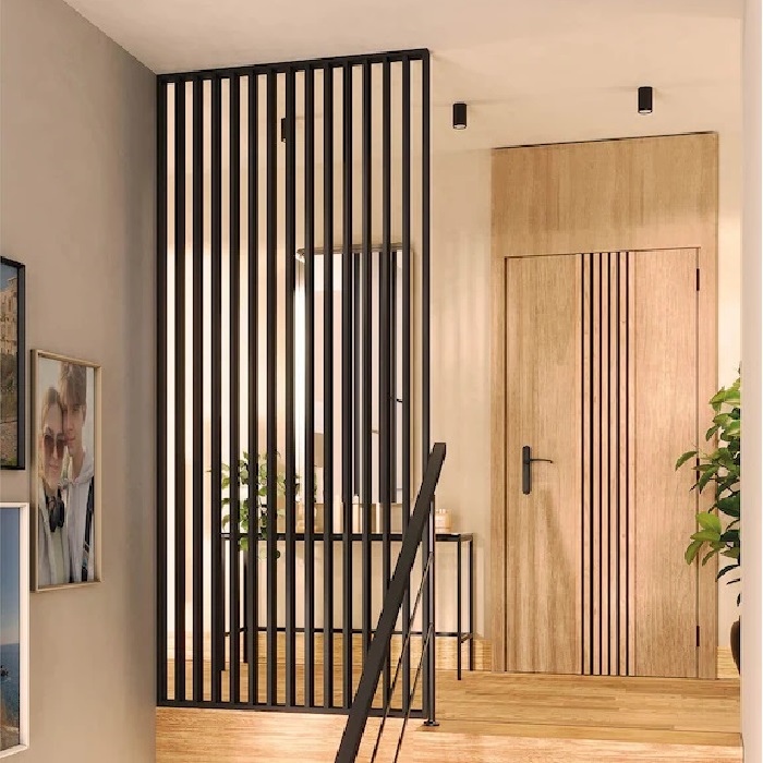 Перегородка из реек, Черная придаёт интерьеру современный и функциональный вид, идеально подходящий для эстетичной и лёгкой организации пространства. Этот комплект вертикальных реек из МДФ идеально подходит для креативного оформления интерьера, с простым монтажом и универсальным дизайном.