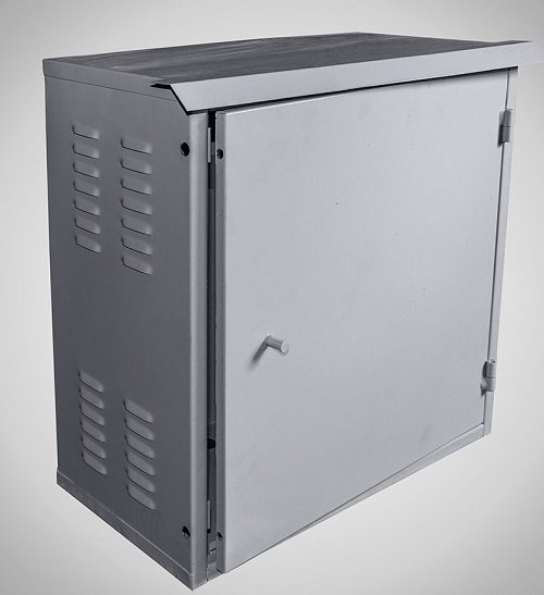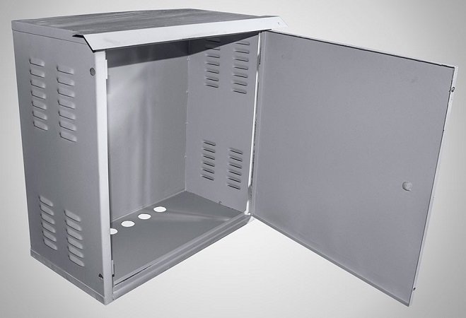Коммуникационный шкаф с монтажной платой. Металлический моноблочный шкаф. Боковые панели выгнуты из цельного листа. Задняя панель крепится к боковым панелям с использованием специального профиля. Наружная и внутренняя поверхности шкафа покрыты текстурированной эпоксидно-полиэфирной эмалью серого цвета. Благодаря своей прочности металлические шкафы идеально подходят для эксплуатации в помещениях, где они могут подвергаться внешним механическим воздействиям.
