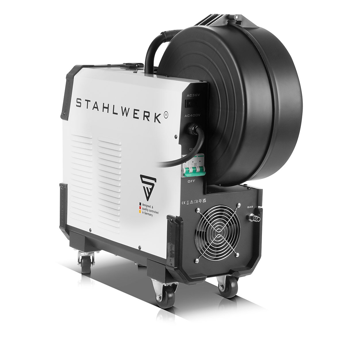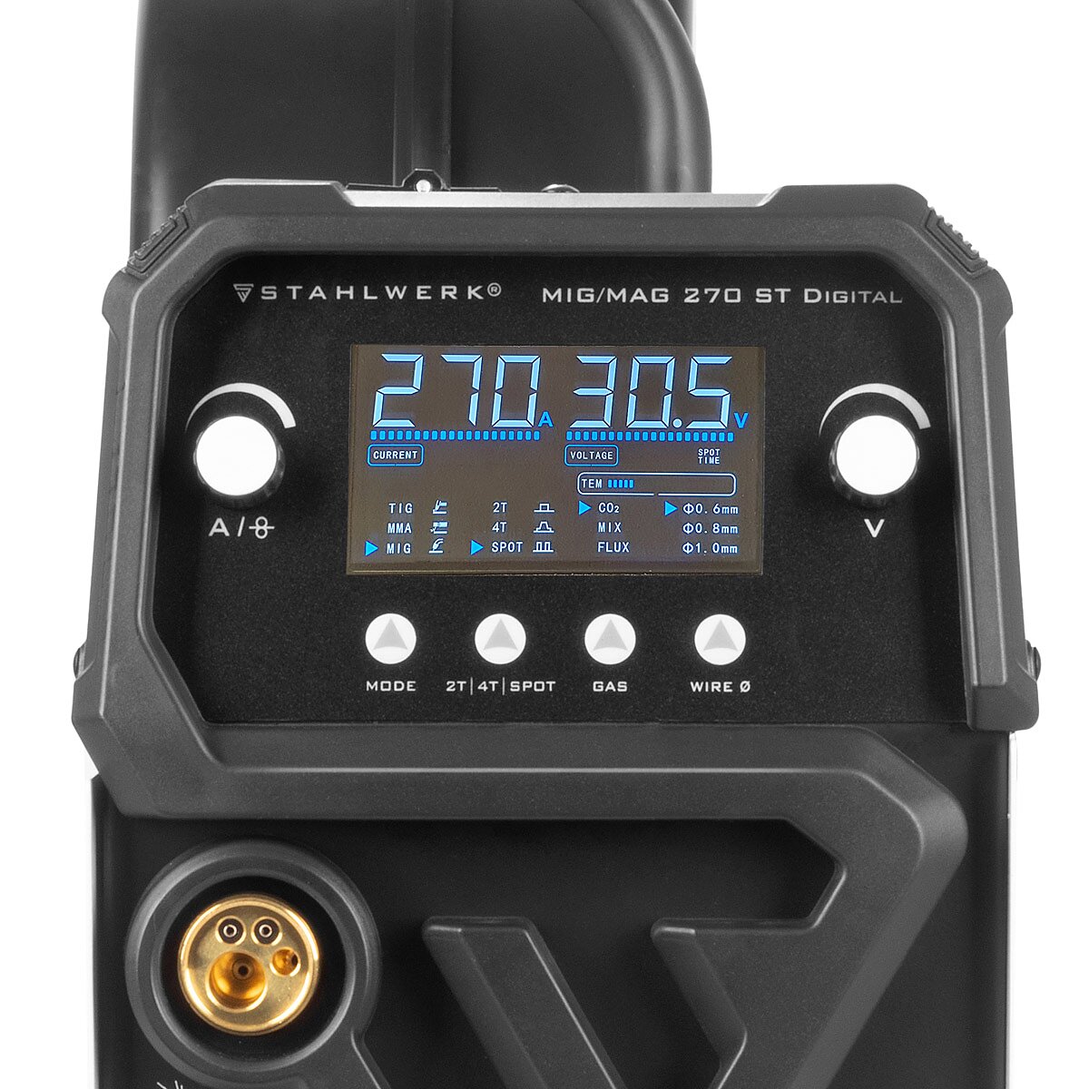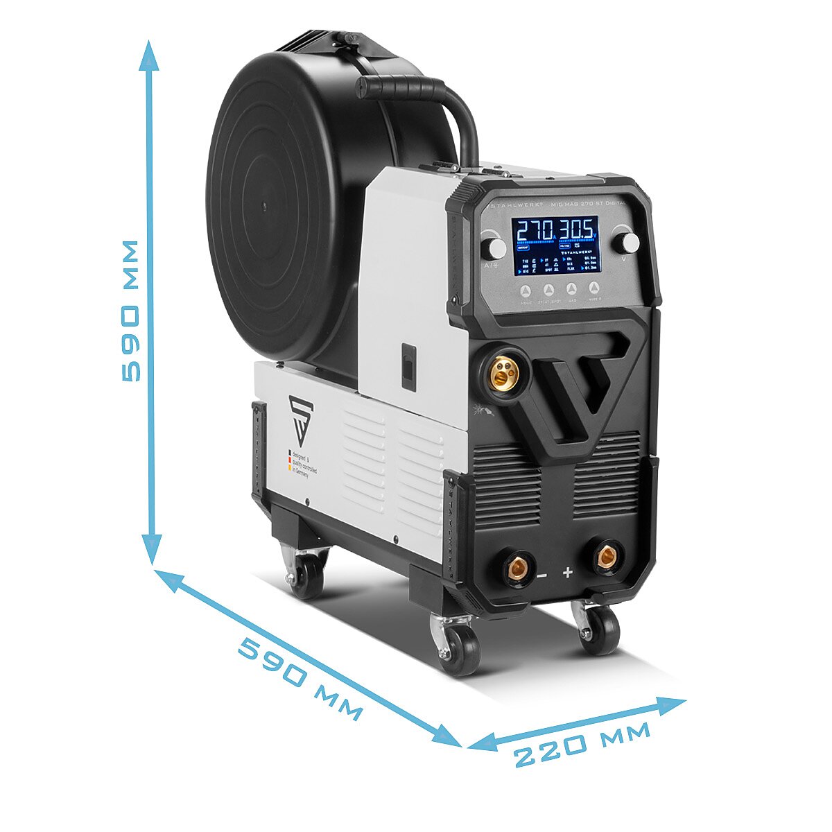 Сварочный аппарат STAHLWERK MIG MAG 270 ST Digital оснащен синергетической подачей проволоки, работает с током до 270 А и подходит для сварки MIG MAG, а также для сварки под флюсом, Lift TIG и MMA/ARC, поэтому сварка также возможна без защитного газа. Устройство имеет множество параметров сварки и обеспечивает точную сварку тонколистового металла, листового металла и нержавеющей стали. Мощный 4-роликовый привод обеспечивает надежную подачу проволоки, а также непрерывную и безопасную подачу более толстой сварочной проволоки во время сварки MIG MAG. Параметры сварки легко считываются на четком цифровом дисплее. Различные режимы можно быстро настроить с помощью интуитивно понятного меню. Инвертор, оснащенный технологией IGBT последнего поколения, обеспечивает выдающиеся сварочные свойства благодаря более высокому КПД и снижению энергопотребления.