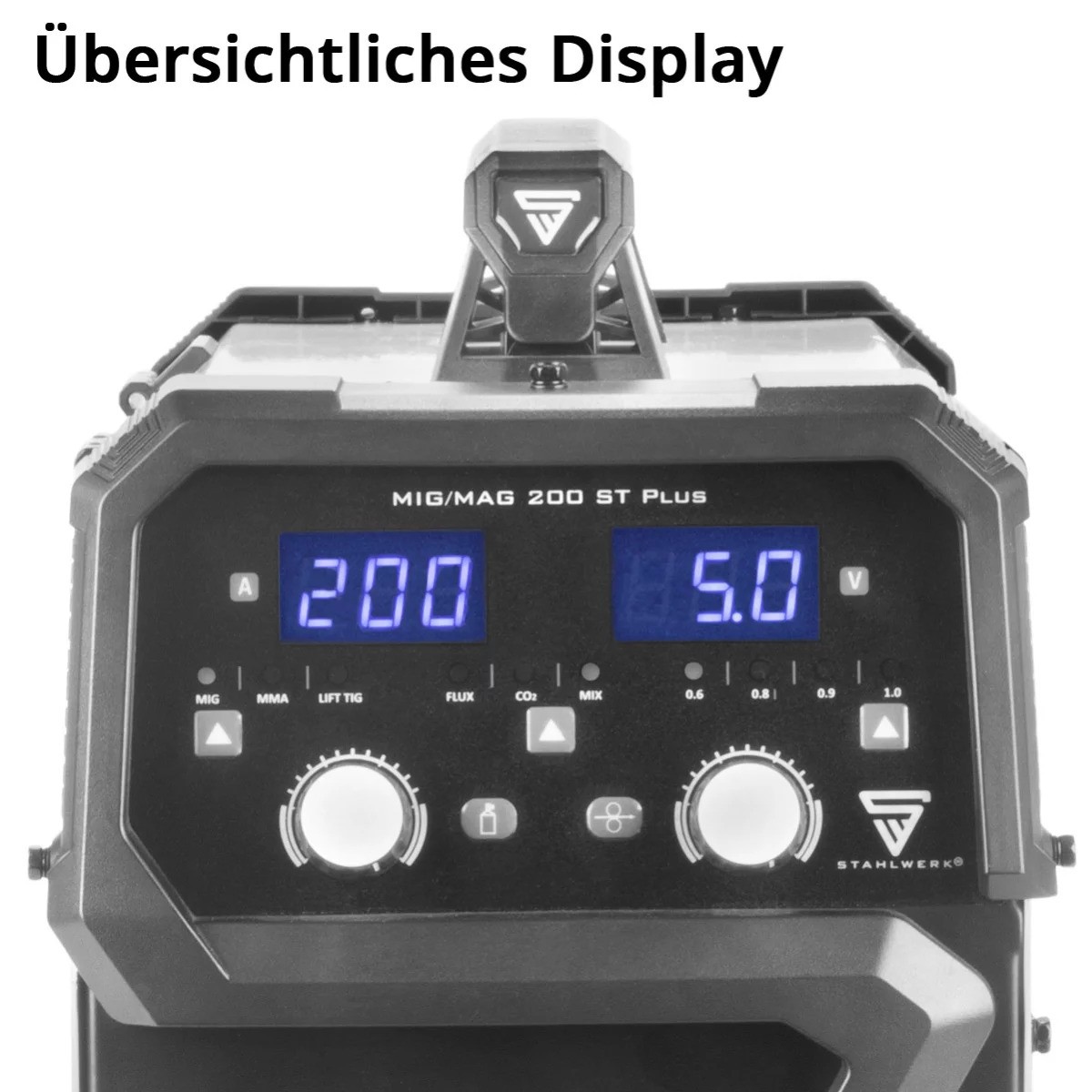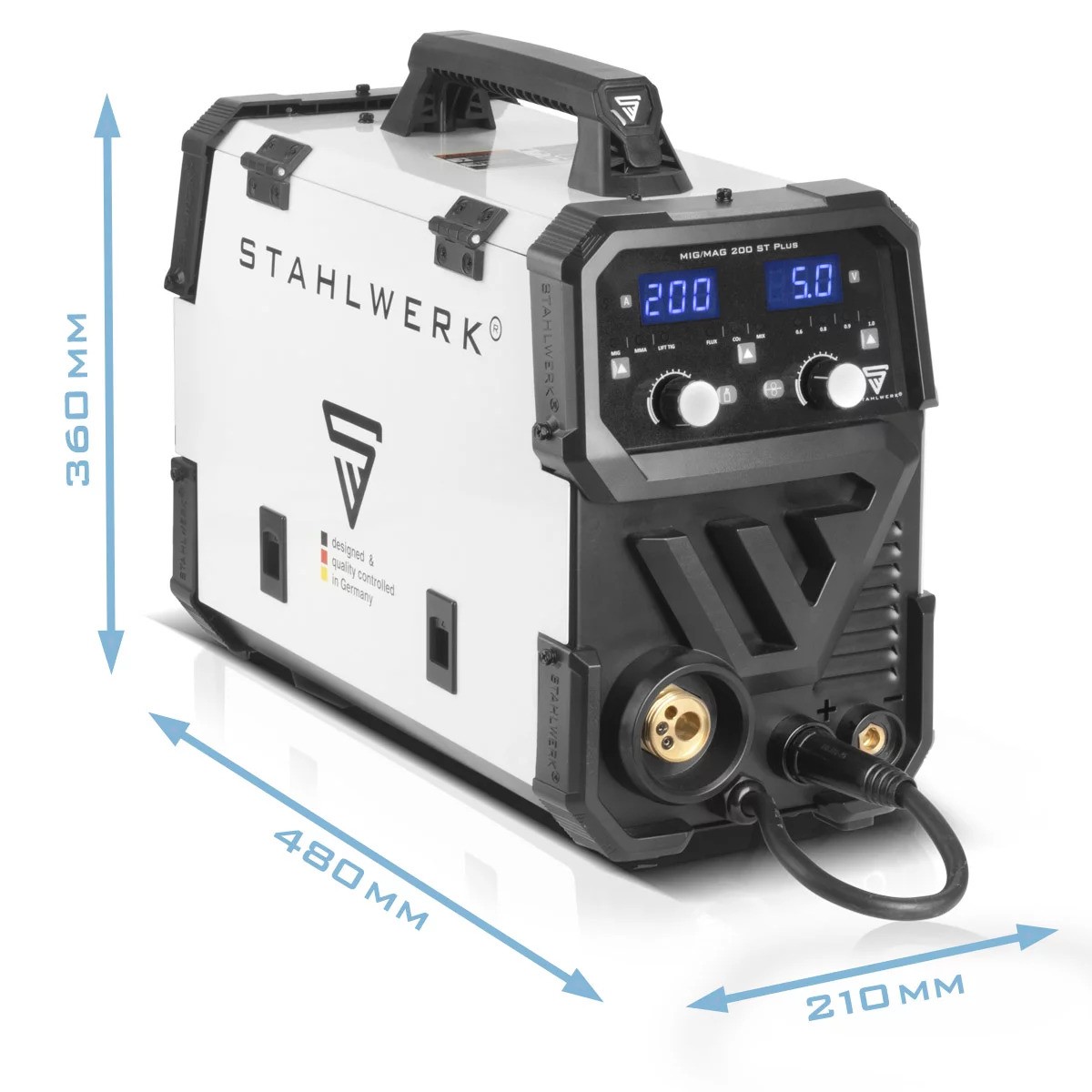 Аппарат STAHLWERK MIG MAG 200 ST PLUS полностью синергический, работает с током до 200 ампер и оснащен новейшей технологией IGBT последнего поколения. Комбинированный сварочный аппарат идеально подходит для сварки MIG MAG, а также имеет функцию Lift TIG. Сварочный аппарат также подходит для сварки электродами и для сварки порошковой проволокой FLUX. Помимо интеллектуального охлаждения со встроенной защитой от перегрева, сварочный аппарат имеет синергетическую подачу проволоки. Скорость подачи проволоки автоматически регулируется установленным сварочным током. Кроме того, инвертор подстраивает параметры мощности под толщину проволоки, установленную в устройстве, что обеспечивает превосходные сварочные свойства и приводит к оптимизированному результату работы. В качестве особой изюминки сварочный аппарат имеет встроенную светодиодную подсветку для освещения направляющей проволоки.