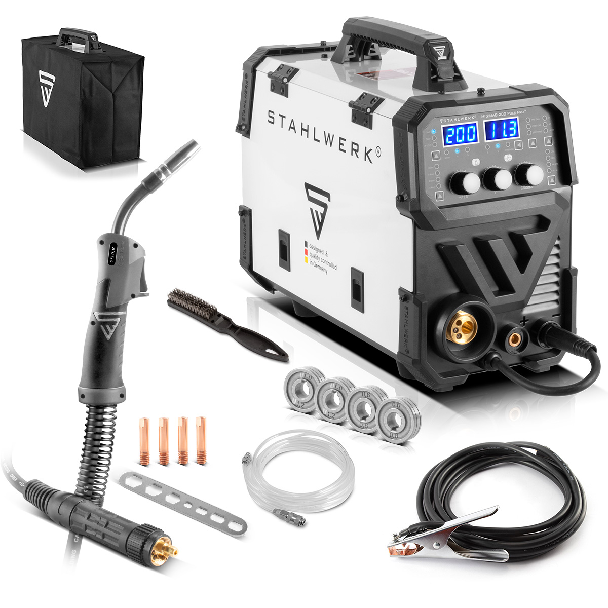 Полностью синергетический сварочный аппарат постоянного тока STAHLWERK MIG/MAG 200 Pulse Pro 5-в-1 IGBT. Сварочный аппарат MIG/MAG для сварки в защитной среде, у которого регулируются различные параметры сварки. Благодаря импульсной функции обеспечивается лишь низкое тепловложение в заготовку и возможность сваривать алюминий. Полностью синергетический сварочный аппарат автоматически регулирует напряжение и подачу проволоки с помощью заданного сварочного тока. Устройство также предлагает порошковую проволоку MMA и функцию Lift-TIG. Сварочный аппарат создан с использованием новейшей технологии IGBT. Это обеспечивает высочайшую производительность и высокий рабочий цикл (ED)! Агрегат с приводом на 4 ролика может использовать рулоны весом 1 кг и 5 кг. Заменив приводные ролики, можно обрабатывать и алюминий. Когда функция VRD включена, выходное напряжение сварочного аппарата снижается до безопасного уровня, чтобы защитить оператора при прикосновении к электроду во время перерыва в сварке.