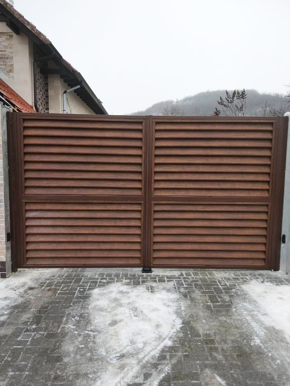 Прочность. Жесткие ламели и прочные опорные столбы обеспечивают устойчивость и долговечность забору жалюзийного типа.